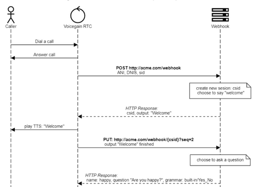 Below is an example of a simple phone call interaction which is controlled by Telephony Bot API. The sequence diagram shows 4 callbacks during a toy survey call: